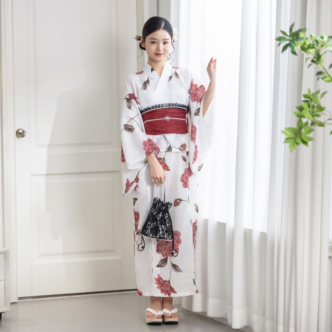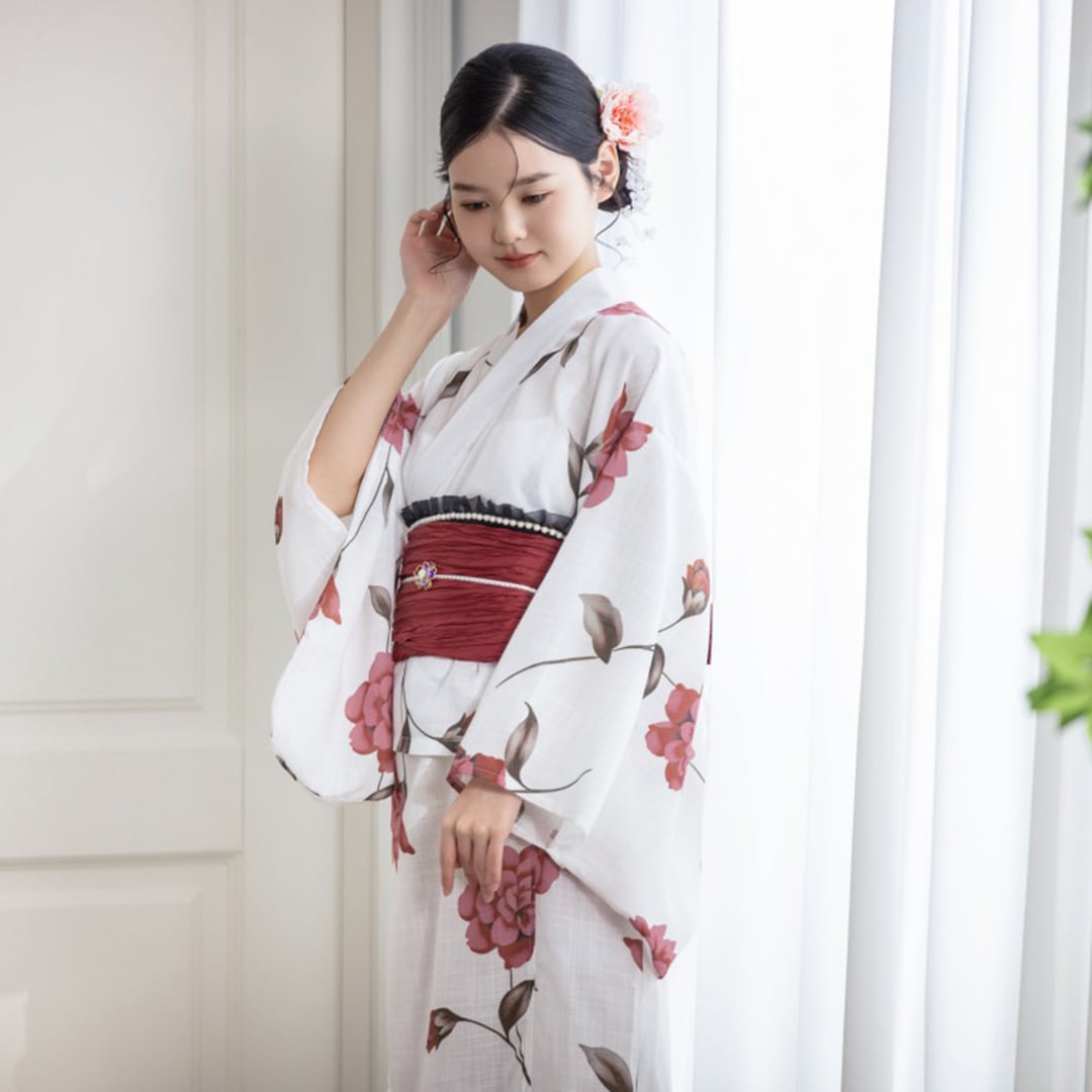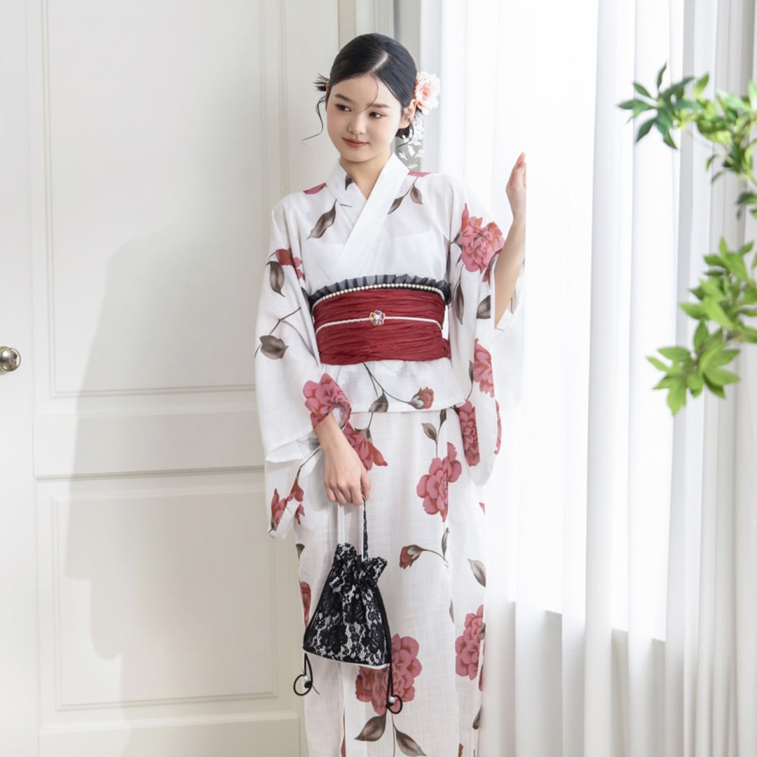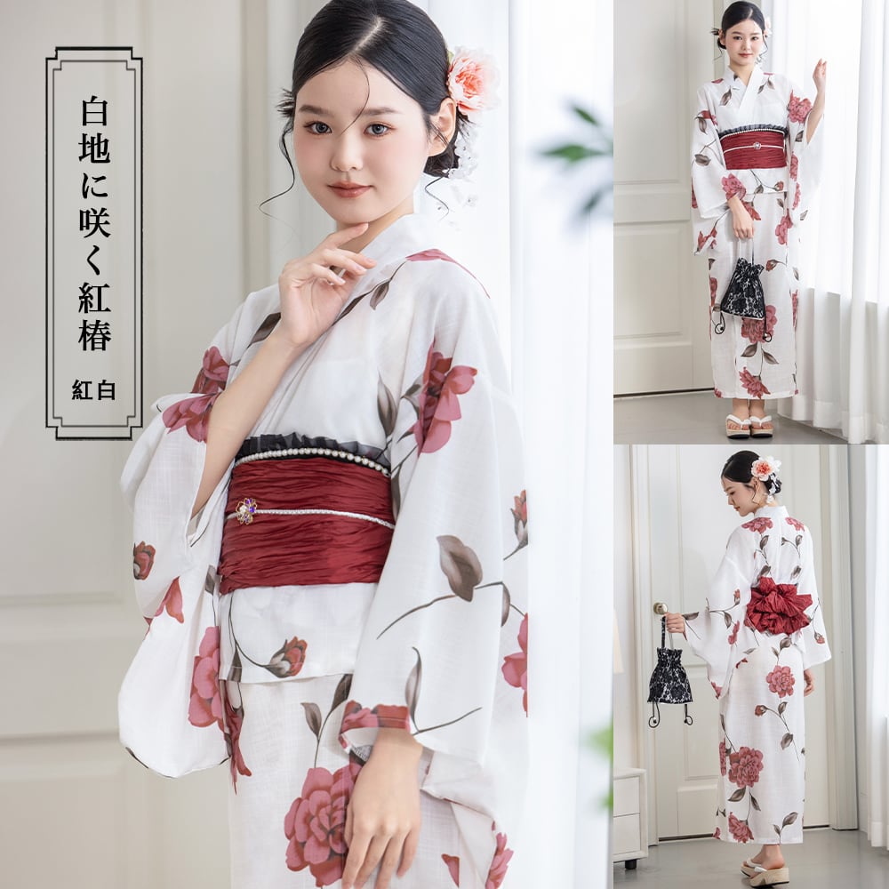 【予約販売開始】白地に咲く紅椿 【浴衣3点セット 羽織/ワンピース/兵児帯】YD-058