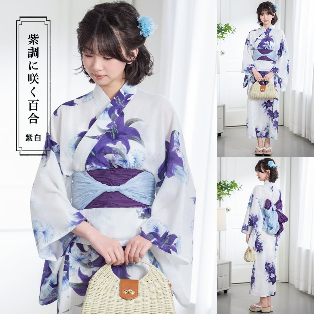 【予約販売開始】紫調に咲く百合 【浴衣3点セット 羽織/ワンピース/兵児帯】YD-073