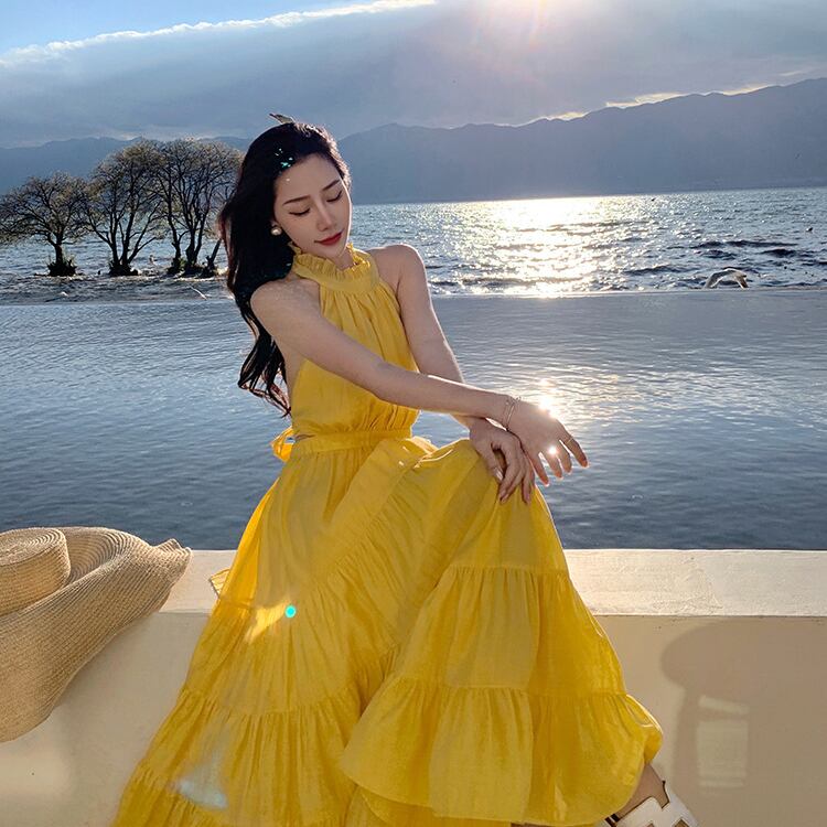 【2色】サンドレス 高見え ホルターネック 可愛い ハイウエスト 着瘦せXH2-QJ8982
