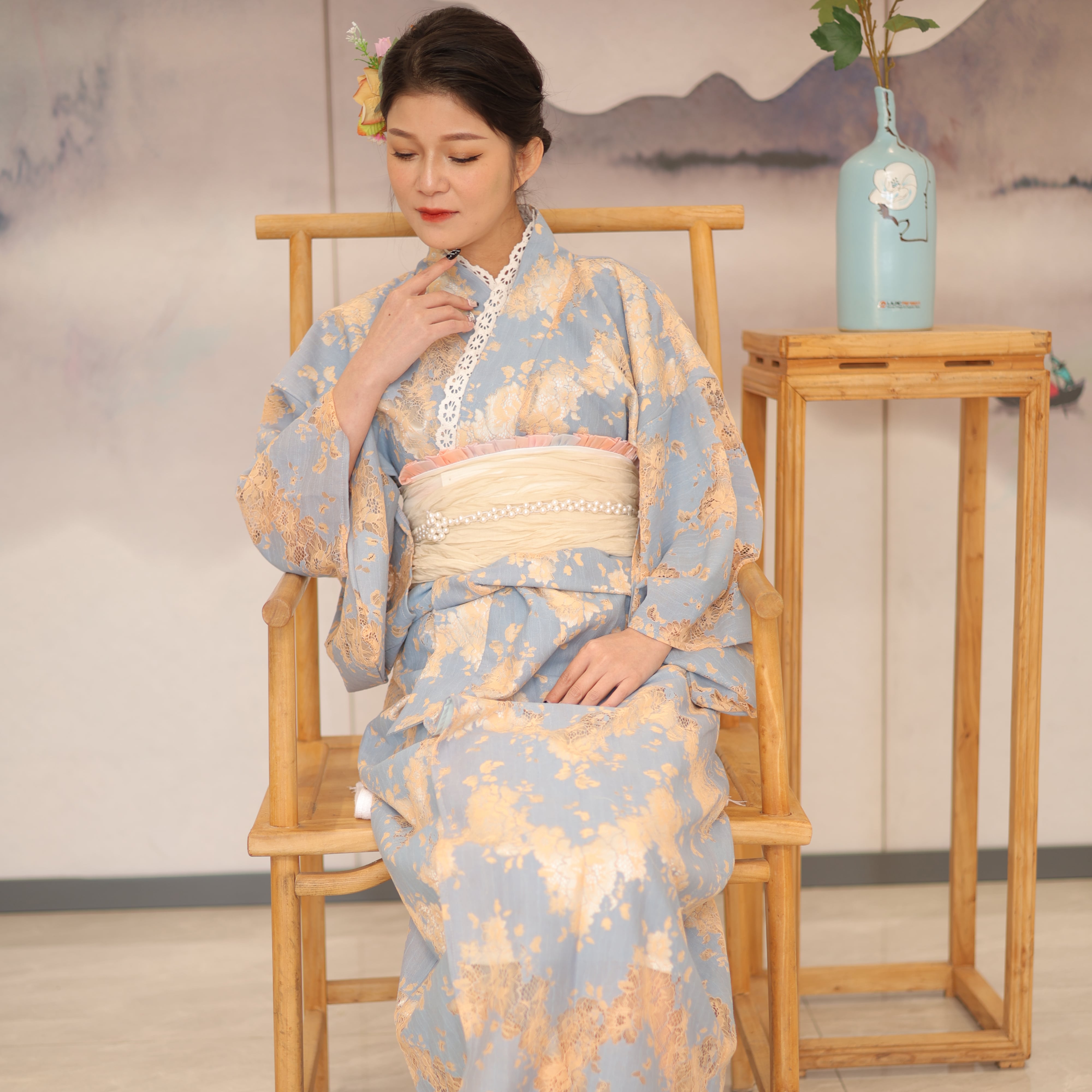 夏の夜に映える、上品で涼しげな青の総レース浴衣。