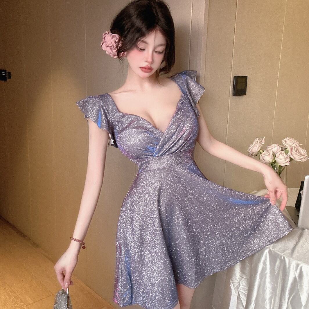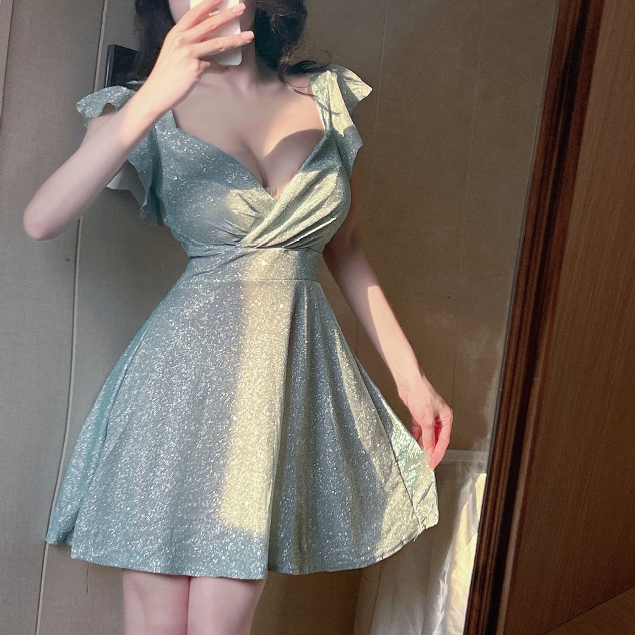 【3色】キャバドレス ミニドレス フリル セクシー 谷間露出 キラキラ YH2-DD6436