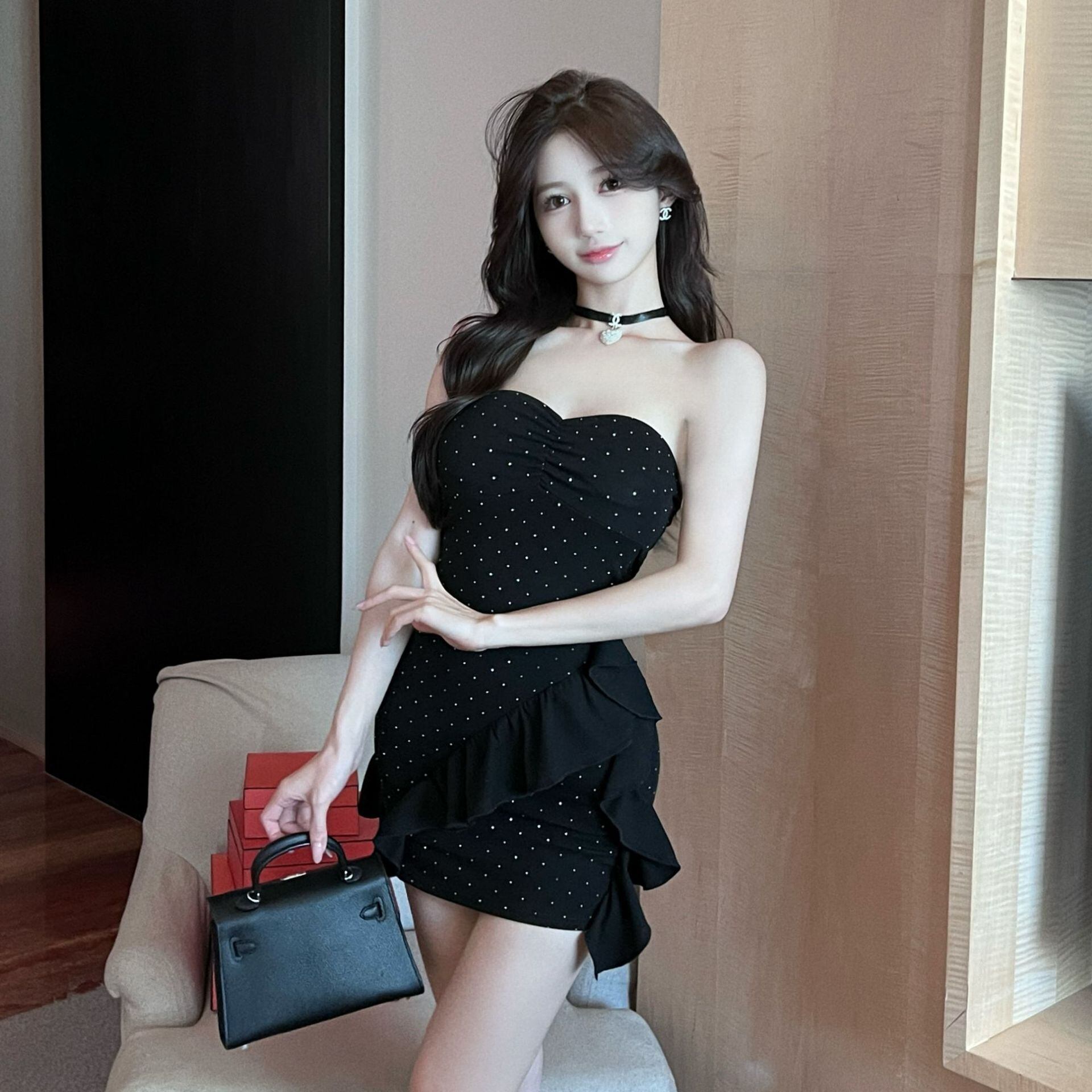 ミニドレス キャバドレス ベアトップ 水玉柄 フリル カワセクシー 肌見せ 指名 XH2-DD7577